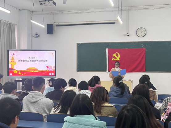 活动开始全体起立奏唱国歌《义勇军进行曲》,全体成员声音洪亮、精神饱满,接着由冷翔老师宣读第三十期入党积极分子培训班结业名单和优秀表彰的决定,并由弋兵书记给优秀学员、优秀组织者及优秀小组颁奖。下一项为优秀毕业员工代表邓茜竹发言,她表示自己今后将不断加强政治理论学习,提高思想道德修养,争取早日成为一名光荣的共产党员。最后一项是弋兵书记作结业总结讲话并宣布培训班正式结业,他首先对同学们顺利完成党课及考试表示祝贺,希望同学们能将所学知识应用到今后的学习、生活和工作中,用理论指导实践,在实践中升华认识,不断开拓创新,积极进取。