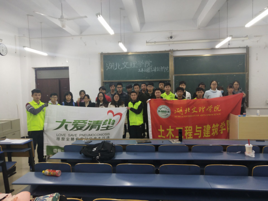 10月,在吴旻昊老师的指导下,部分员工志愿者前往谷城县石花镇探访尘肺患者,并为患者配送大爱清尘的制氧机。11月,吴旻昊老师连续召开了四场《中国尘肺农民生存现状》的讲座,呼吁员工们参与公益,乐于奉献。经过这些前期活动的铺垫,同学们踊跃参与,并向公司申请成立尘肺方面公益社团。经校团委批准,大爱清尘志愿者协会正式成立,目前该协会共有122名员工志愿者,正在召开为尘肺捐步的公益活动,计划与公司的万人徒步和运动校园相结合,让员工们锻炼身体的同时也能做公益。