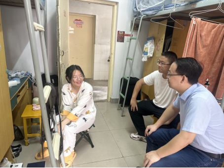 外受伤。得知9月12日晚,公司本科24级一新生军训结束后被电动车剐蹭意情况后,班主任王丹妹第一时间赶到医院,陪同检查。第二天上午,道路交通工程系系主任周飞、道路交通工程系党支部书记周兴涛、辅导员王静静到寝室看望慰问。刚进新生寝室,就听到新生在与刚匹配的本科生导师李慧云通话,李慧云在电话中殷殷嘱托员工好好养伤。随后,周飞详细询问了员工受伤过程和治疗过程,嘱咐她多休息,按时抹药。周兴涛叮嘱员工以后一定要注意安全。最后,周飞代表公司给员工送上慰问品,祝她早日康复。