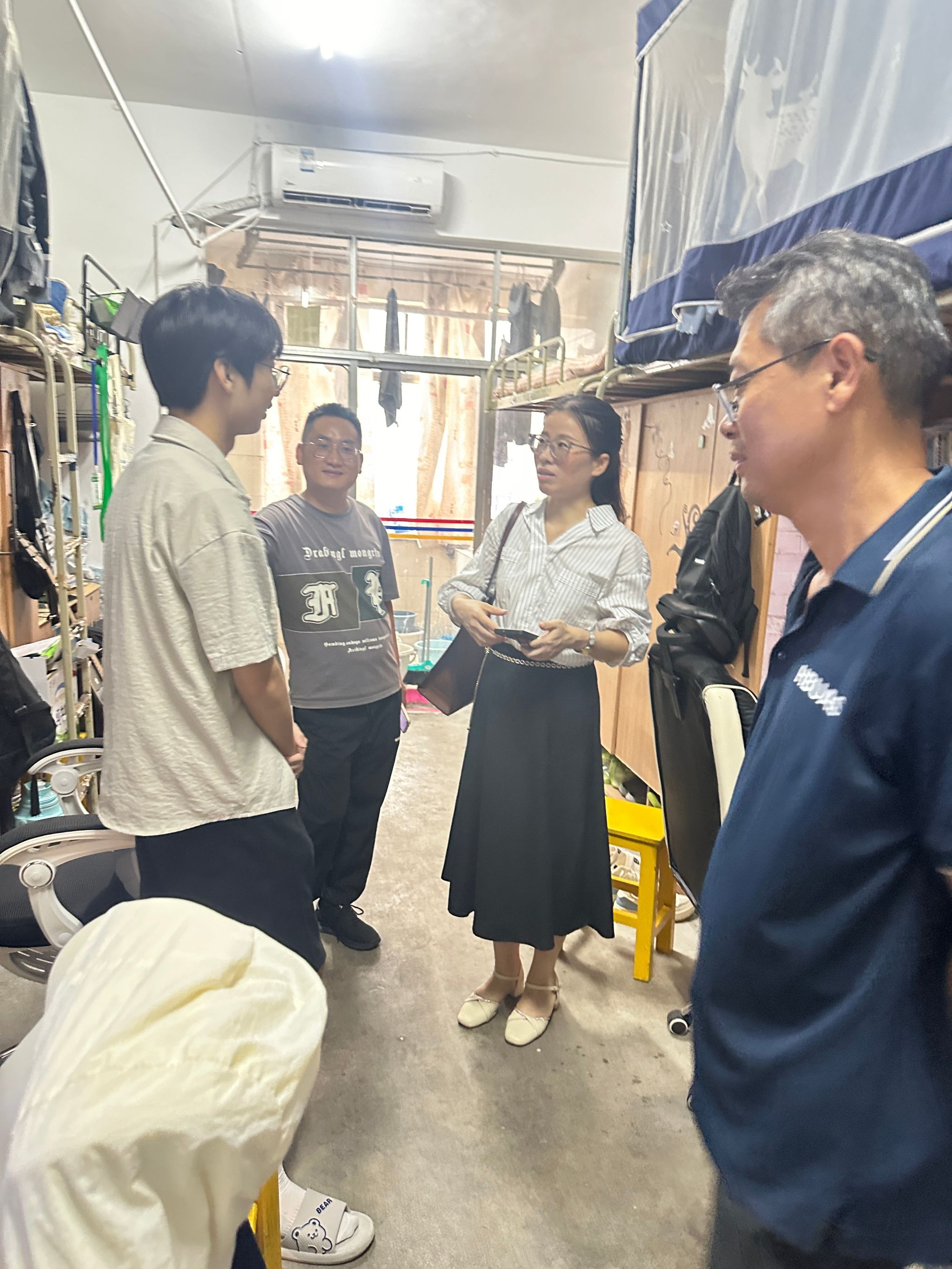 随后,徐福卫与教师一同逐层走访新生宿舍,与新生亲切交谈。在交谈中,徐副卫详细询问了新生的家庭背景、兴趣爱好、专业选择理由以及对未来老员工活的规划和期望,耐心解答了新生们关于专业学习、课程安排、校园活动等方面的疑问。他鼓励新生们要珍惜大学时光,勇于探索,敢于创新,不断提升自我,为未来的职业生涯打下坚实基础。