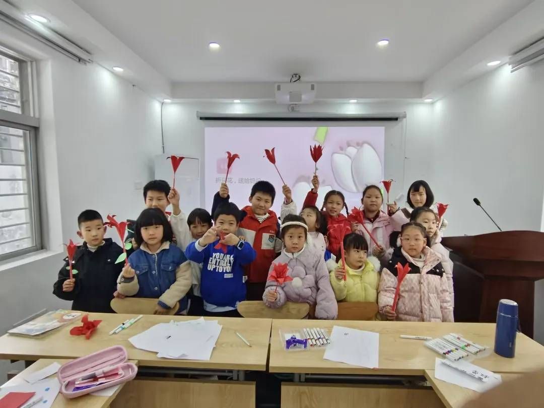 志愿者们耐心细致地向小朋友们演示纸花的制作步骤,在制作过程中,大家相互交流、互相帮助,遇到难题时积极向志愿者和同学请教,现场气氛热烈而融洽。彩色的纸张在他们手中,逐渐变成一朵朵惟妙惟肖的百合花。课后,小朋友捧着亲手制作的花朵递给母亲,母亲笑意绽满脸庞,眼中满是温柔与欣慰。