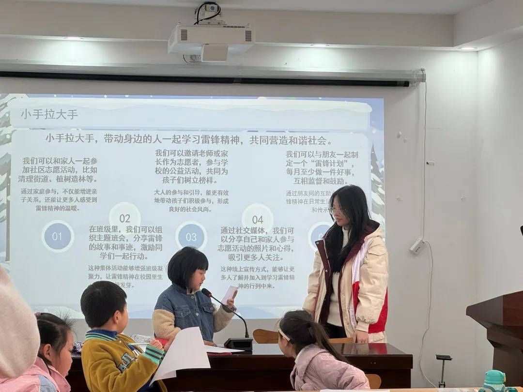 志愿者们与小朋友们一同开唱《学习雷锋好榜样》。歌声飞扬,小朋友们眼睛亮晶晶,跟着节奏拍手,在激昂旋律里感受雷锋精神,现场满是温暖与朝气。