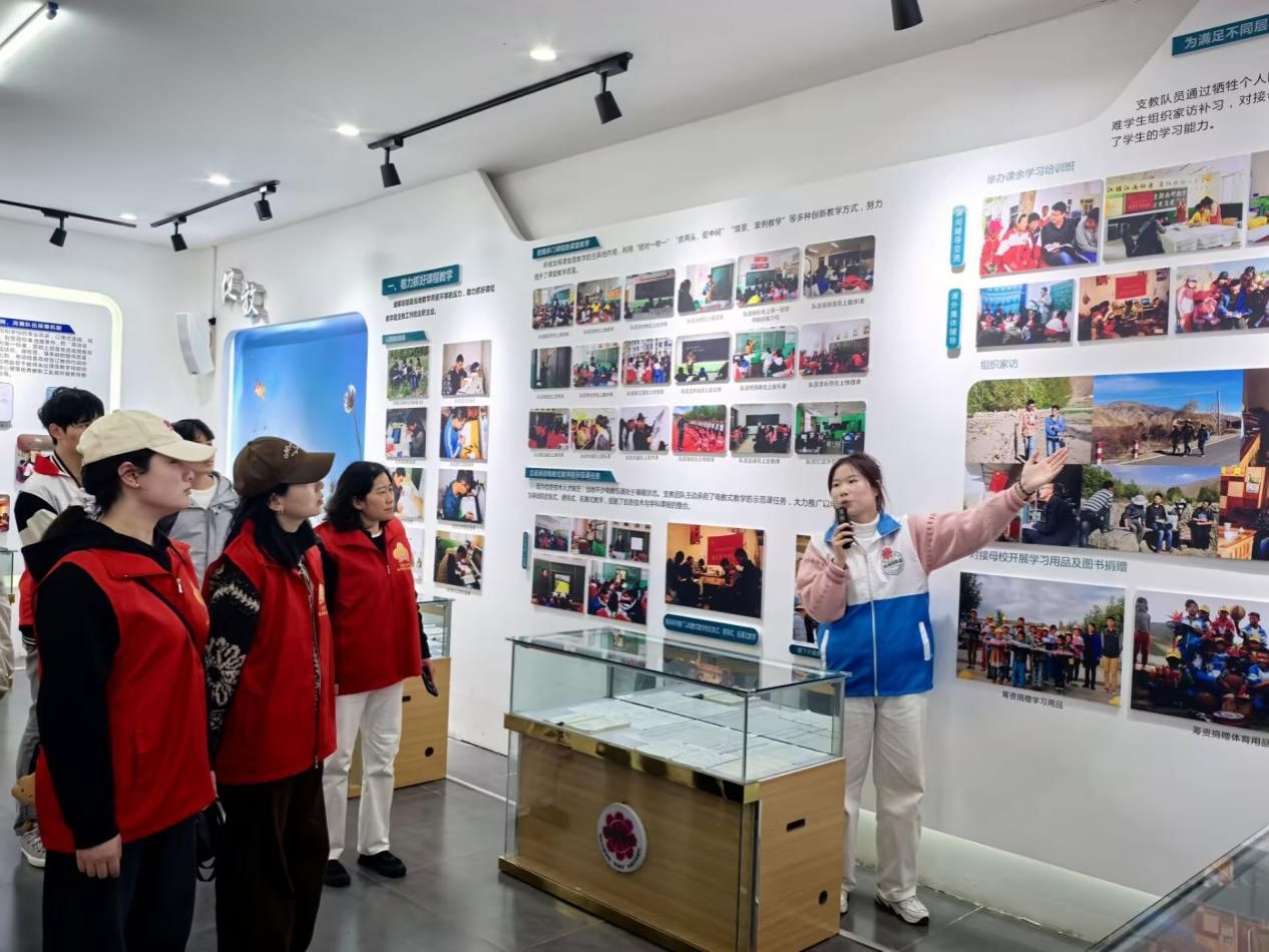 在展厅讲解员的引导下,两支队伍依次参观了“含苞”“绽放”“流芳”“花语”四大主题展区。“含苞”展区:通过历史影像和文献资料,志愿者们了解到威廉希尔自2014年起响应襄阳市对口援藏号召,组建“格桑花”支教团队支援西藏琼结县教育的初心。首批队员克服高原环境挑战,为当地教育注入新活力。“绽放”展区:一幅幅支教照片、一封封员工手写信,展现了支教队员创新教学实践、推动信息技术与课程融合的历程。团队开设“第二课堂”、建立心理辅导室、捐赠图书等举措,成为提升当地教育质量的生动注脚。“这些带着高原泥土的物件,比任何教科书都更震撼心灵。”砼心筑梦志愿服务队员工孙博源在观展笔记中写道。“流芳”展区:陈列的荣誉证书和媒体报道,见证了团队荣获“中国好人榜”“全国民族团结进步模范集体”等国家级表彰的卓越成效。校地互访43次、西藏籍员工就读人数攀升等成果,彰显汉藏情谊的深化。“花语”展区:三赴高原并扎根西藏的吴顺喜、带病坚守岗位的项立刚等队员的故事,让志愿者们深刻感悟“青春之花绽放在祖国最需要的地方”的奉献精神。“原来教育扶贫不是简单的知识传授,而是用生命唤醒生命。”巷阳花志愿服务队队长邹关勇在交流中感慨道。