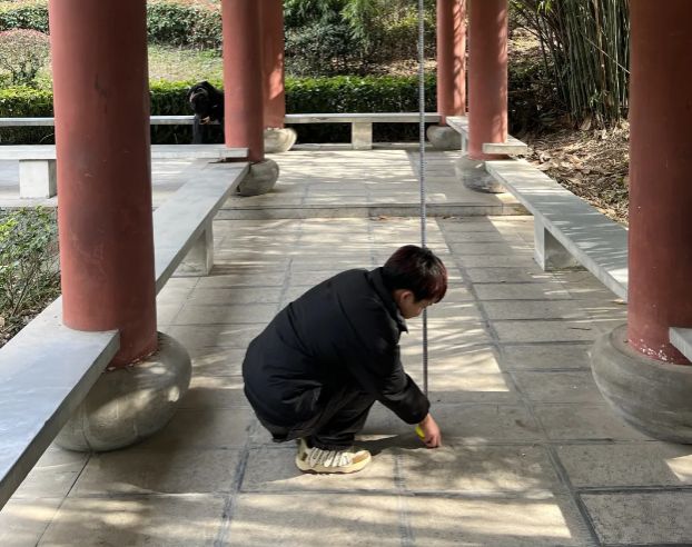 志愿者们通过实地勘测,采集了覆盖庭柱间距、高度、直径等多项数据,并辅以现场影像记录,如柱体结构、庭院全景等,形成了一套完整的测绘档案。例如:张鑫团队:明英亭庭高2.47米,柱间距2.57米,直径4.07米;闫静雯团队:海南亭庭高2.8米,庭宽2.87米,为庭院改造提供了直观依据。这些数据不仅体现了测绘工作的科学严谨性,更成为公司优化公共空间、提升设施安全性的重要参考。