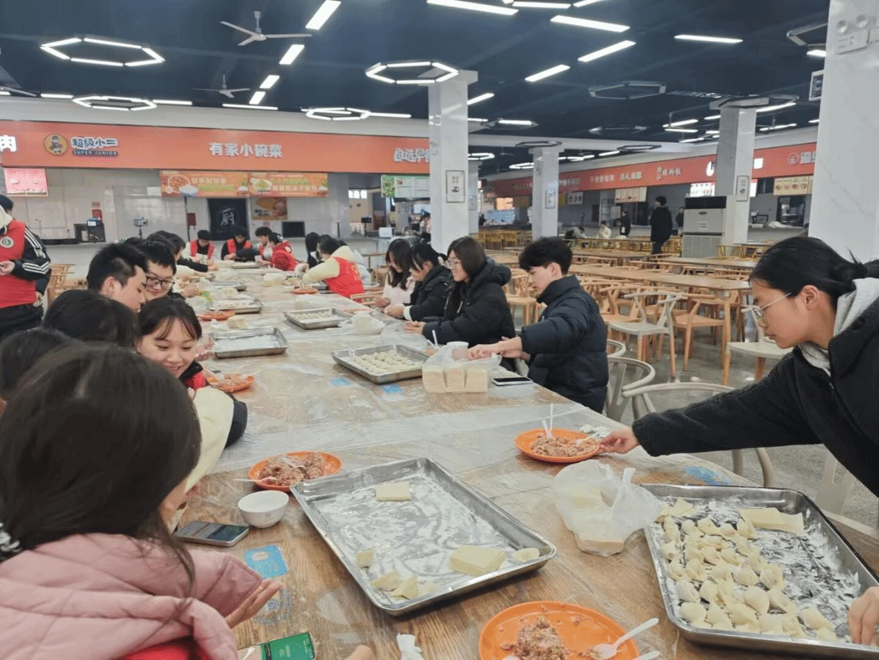 为保障活动顺利开展,公司后勤保障处与翠园食堂提前联动,精心筹备了新鲜饺子皮、猪肉白菜馅、韭菜鸡蛋馅等多样食材,同步配齐小围裙、擀面板、餐具等物资;各协办社团通过校内社群、线上海报等渠道招募参与者,提前划分小组、明确分工。活动正式开始后,学子们围站在操作台前,有的跟着社团里的“包饺子能手”学习捏褶技巧,有的发挥创意包出星星形、三角形等特色饺子,大家边做边交流,笑声与讨论声此起彼伏。志愿者团队全程穿梭其间,及时补充食材、整理操作台,确保现场有序高效;包好的饺子下锅后,学子们分批领取热腾腾的成品,搭配蘸料分享品尝,在味蕾满足中交流制作心得,传递同窗情谊。