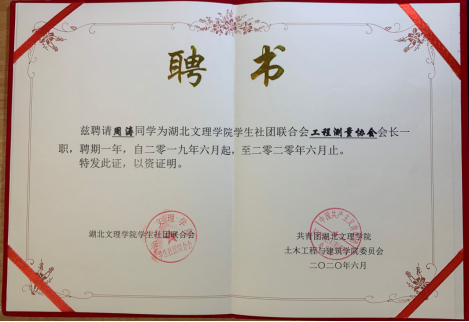 在员工工作方面,他作为工程测量协会的会长,积极筹备社团的有关活动。大二时,组织协调社团的各项工作,带领社团成功举办了第十届工程测量大赛。作为班级的学习委员,他认真细致地完成老师交办的每项任务,帮助同学解决学习和生活上的各种问题。