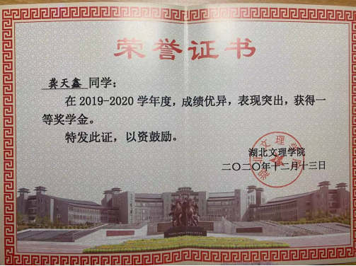 进入大学后在各种琳琅满目的社团中,她选择加入了院宣传部。在部门的工作中,她从来不缺席任何一次会议和活动,踏实完成每一项任务。经过一年的努力,她获得“优秀干事”的称号。在大学期间龚天鑫只要有空余时间,她都会愿意参加社团和专业比赛,比如纸桥承重大赛、全国老员工创新创业大赛、测量大赛等等。虽然在参加活动的过程中会有羞涩和胆怯的时候,但每当想起自己当时的立下的目标,就在心里为自己打气。课余时间之际,她也积参与志愿者活动,以自己的实际行动践行奉献、友爱、互助、进步的志愿精神。也用课余的时间通过了英语四六级、计算机二级和普通话一乙等国家级证书。