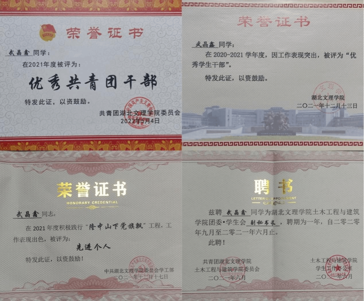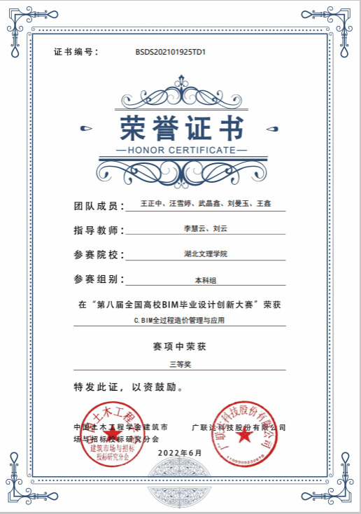 在校期间,她勤勉务实、励精笃行,不仅顺利通过了大学英语四级、普通话一级乙等、计算一级,还自学报考并获得初中数学教团队格证。为了提升锻炼自己,积极参加第八届全国老员工BIM毕业设计大赛,获得国家级三等奖、发表论文《浅谈装配式建筑的应用前景》。