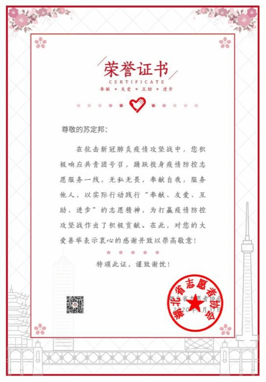 苏定邦积极践行“奉献、友爱、互助、进步“的志愿服务理念,踊跃参与各项志愿服务活动。在疫情期间积极响应号召,参加了公司组织的公益家教活动,辅导身在一线抗击新冠肺炎疫情医护人员的子女,得到了湖北省志愿者协会“抗击新冠肺炎疫情优秀志愿者”的荣誉,同时受到了公司学工处“先进个人”的表彰。他也参加了公司组织的“汉藏一家亲”公益辅导活动,辅导远在西藏的小朋友们,为促进汉藏友谊尽自己的一份微薄之力,受到了学工处“先进个人”的表彰。平日里其他的志愿活动他也积极参加,目前累计的义工时已超过50小时时长。他尽力帮助他人,让爱传递。